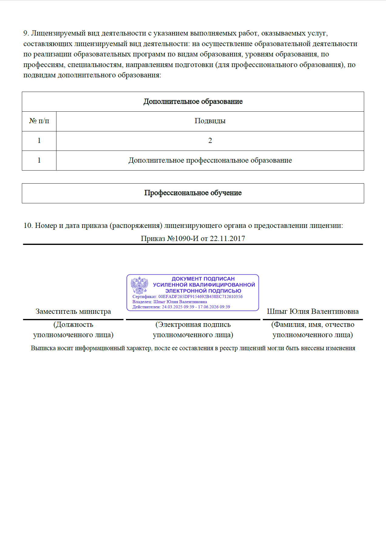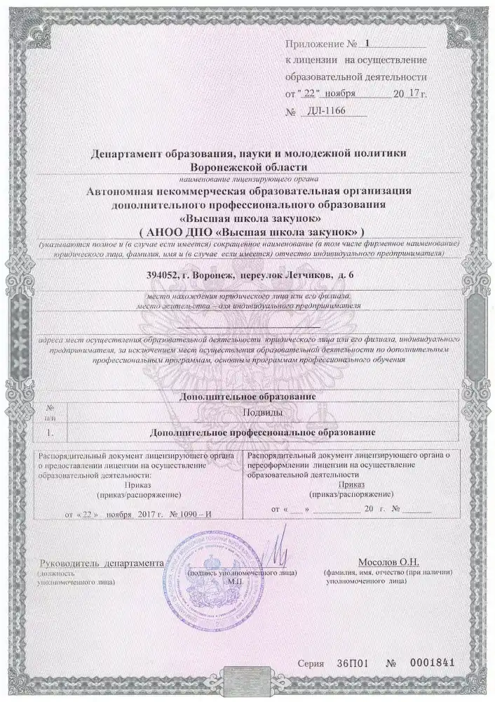 Лицензия на образовательную деятельность Высшей школы закупок