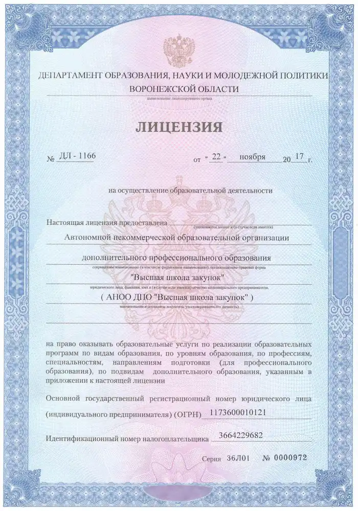Высшая школа закупок имеет официальную и бессрочную лицензию на образовательную деятельность по всей России. Проверьте подлинность лицензии на сайте Рособрнадзора и обучайтесь с гарантией качества.